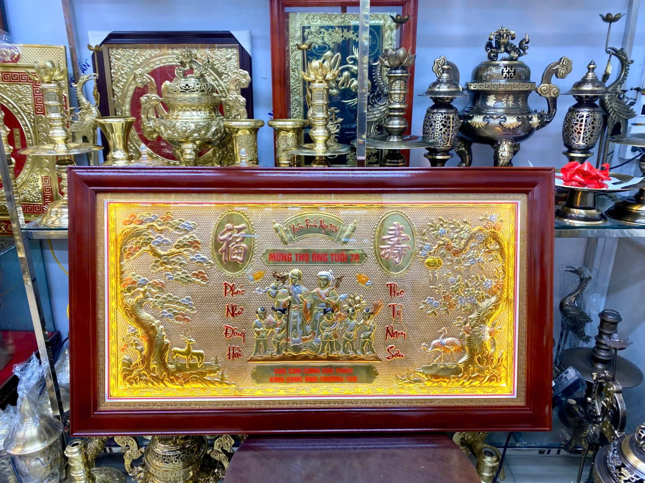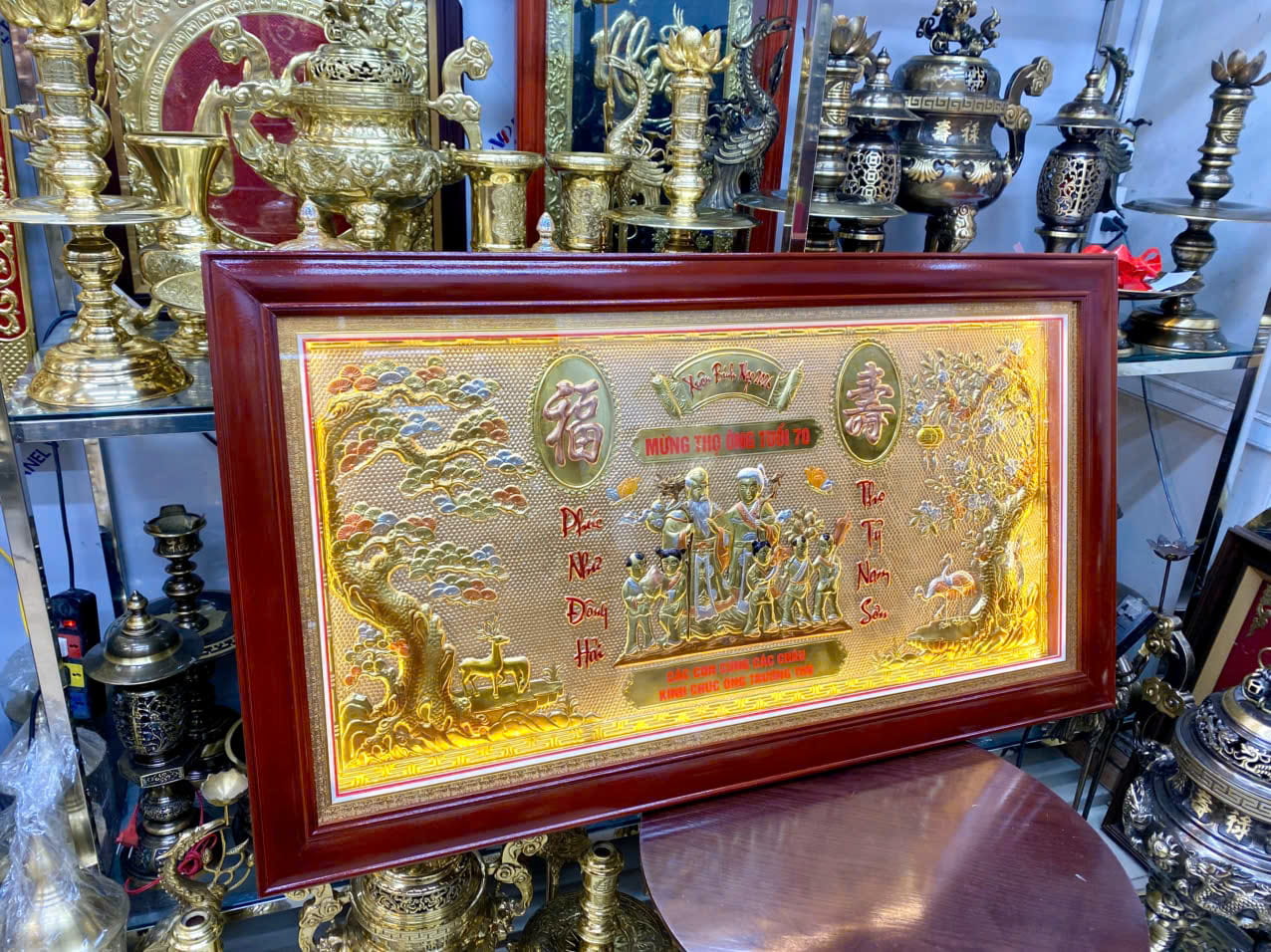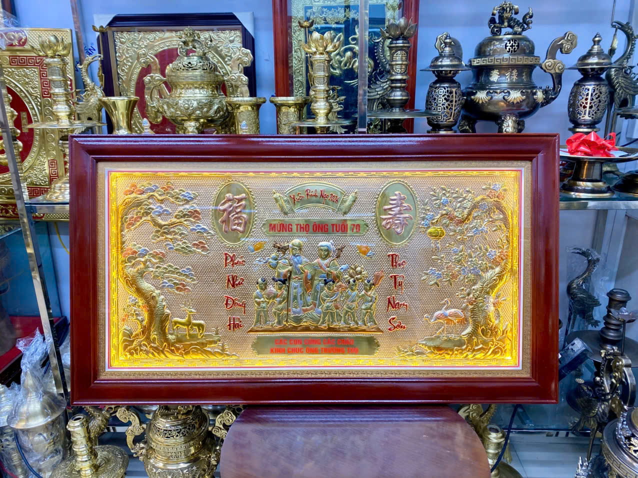 Tranh Mừng Thọ Ông Bà bằng đồng nguyên tấm nền vàng kích thước 70×126 (cm) là dòng tranh cao cấp mang đậm giá trị truyền thống, thường được lựa chọn làm quà biếu mừng thọ ông bà, cha mẹ trong các dịp trọng đại của gia đình. Bức tranh không chỉ thể hiện tấm lòng hiếu kính của con cháu mà còn gửi gắm lời chúc trường thọ, an khang và phúc lộc viên mãn.