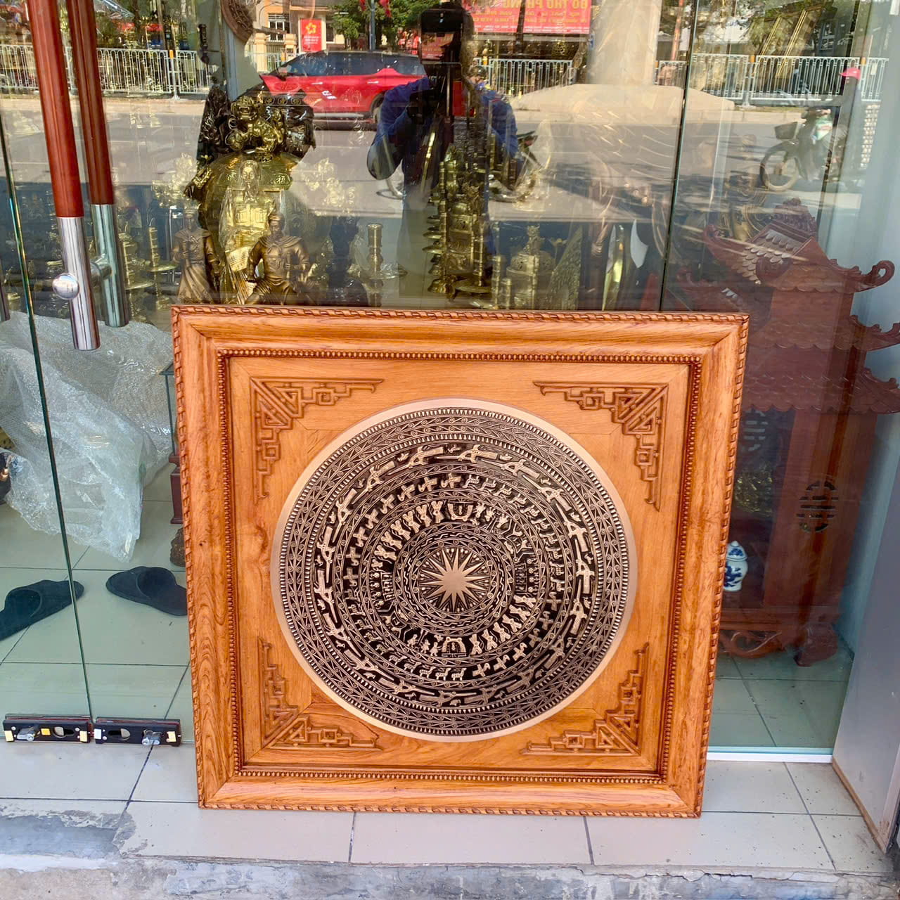 Tranh Trống Đồng Đỏ Đúc Đóng Khung Gỗ Hương (88×88cm) là tác phẩm mỹ nghệ cao cấp mang đậm bản sắc văn hóa Việt Nam, được chế tác dành cho những không gian trang trọng như phòng khách, phòng thờ, phòng truyền thống, cơ quan hoặc làm quà tặng ý nghĩa trong các dịp quan trọng. Bức tranh không chỉ có giá trị thẩm mỹ mà còn thể hiện niềm tự hào về lịch sử, cội nguồn và tinh thần dân tộc.