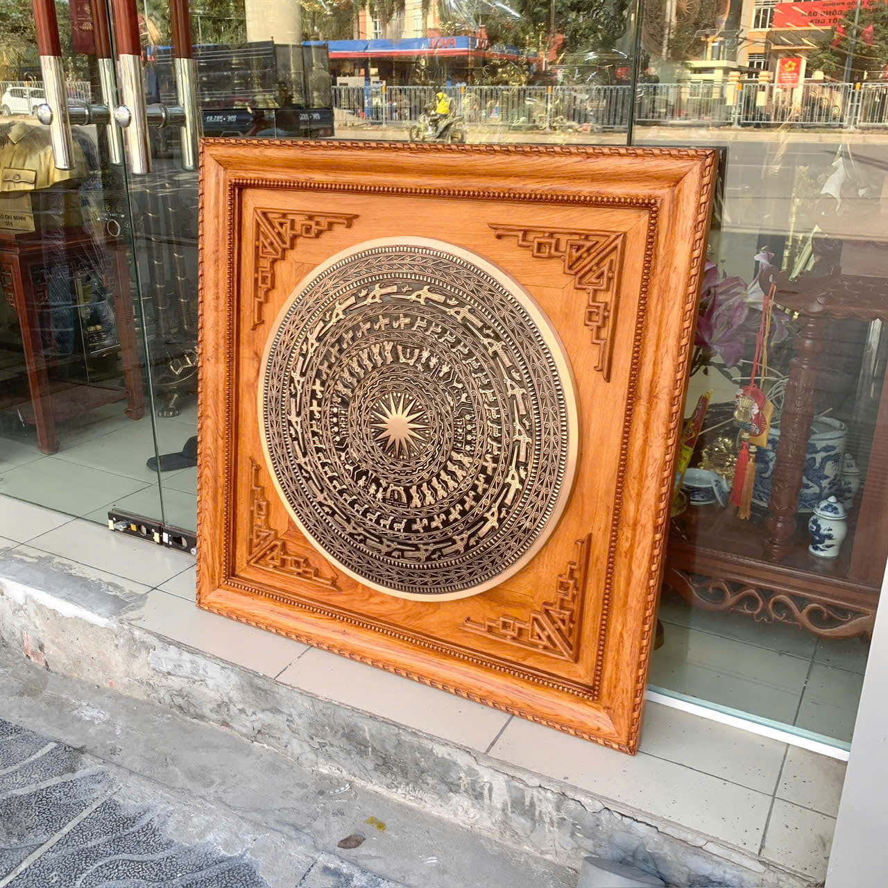 Phần mặt tranh được đúc từ đồng đỏ, loại đồng có hàm lượng đồng nguyên chất cao, cho màu sắc trầm ấm, bề mặt chắc chắn và độ bền vượt trội. Kỹ thuật đúc thủ công giúp tái hiện rõ nét các hoa văn đặc trưng của trống đồng cổ, từ ngôi sao nhiều cánh ở trung tâm cho đến các vòng họa tiết đồng tâm bao quanh. Từng đường nét hoa văn được làm nổi rõ, sắc sảo, tạo chiều sâu và cảm giác sống động cho tổng thể bức tranh.