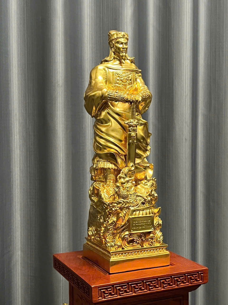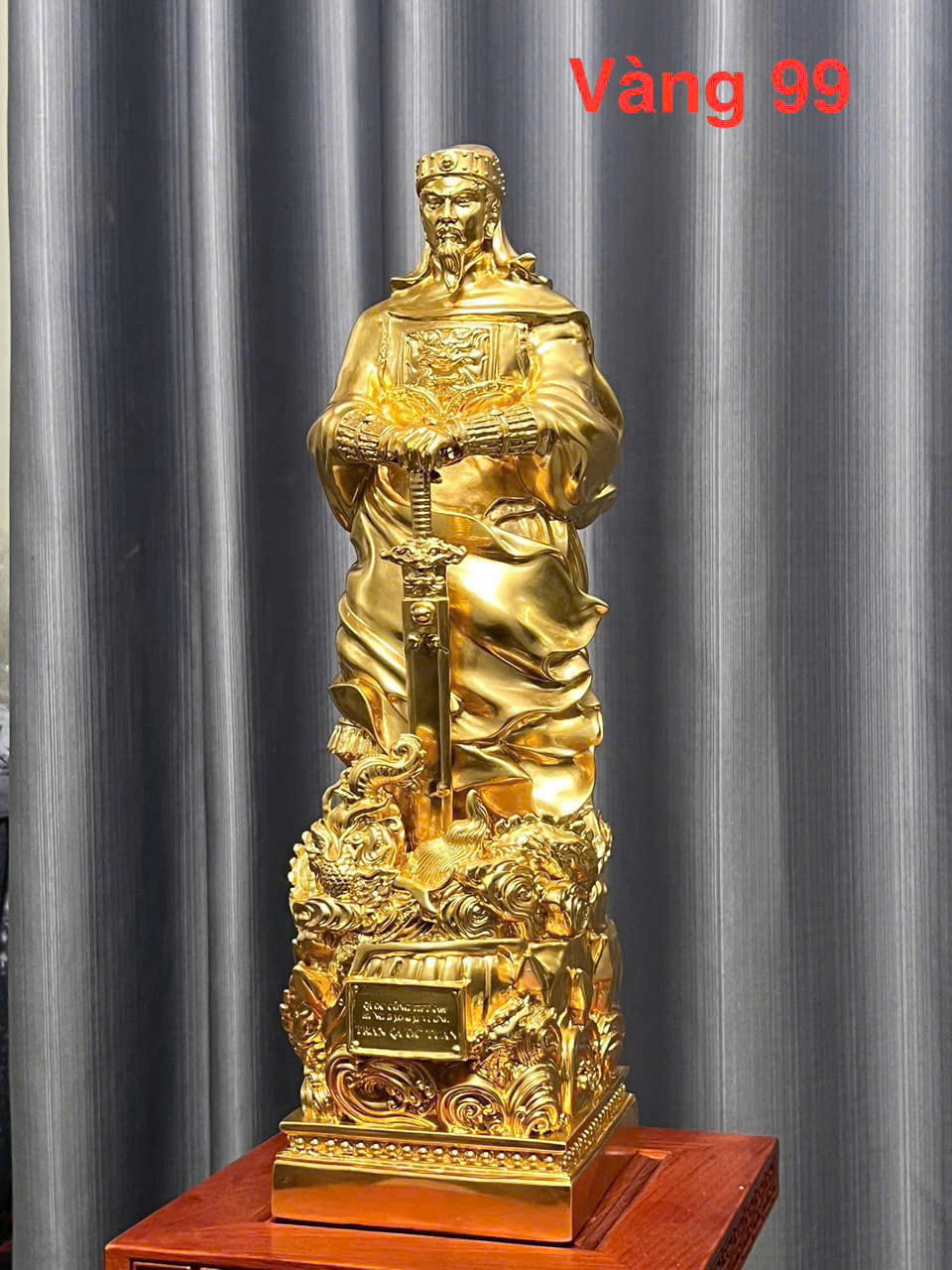 Bề mặt tượng được dát vàng 9999 cao cấp, tạo nên vẻ đẹp rực rỡ, sang trọng và đẳng cấp vượt trội. Lớp vàng phủ lên các chi tiết giúp tôn lên từng đường nét chạm khắc, từ khuôn mặt, mũ mão, giáp phục cho tới tư thế cầm kiếm hoặc cử chỉ oai phong của Đức Thánh. Ánh vàng 9999 không chỉ giúp sản phẩm thêm phần nổi bật mà còn mang ý nghĩa về phú quý, cát tường, trường tồn và tôn kính tuyệt đối trong không gian thờ tự.